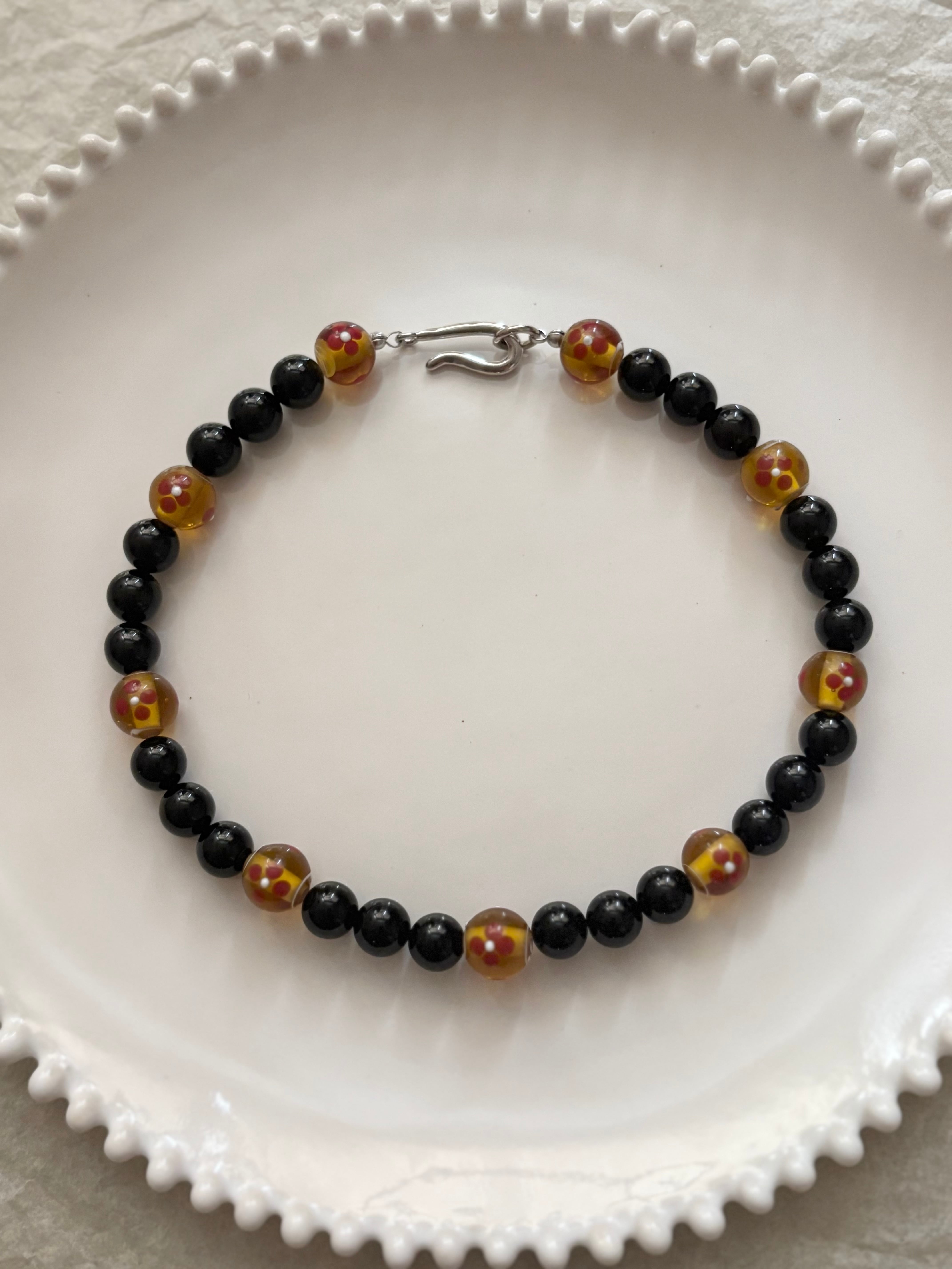 天然石のオニキスストーンとビンテージの花柄ガラスビーズを組み合わせたネックレスです。