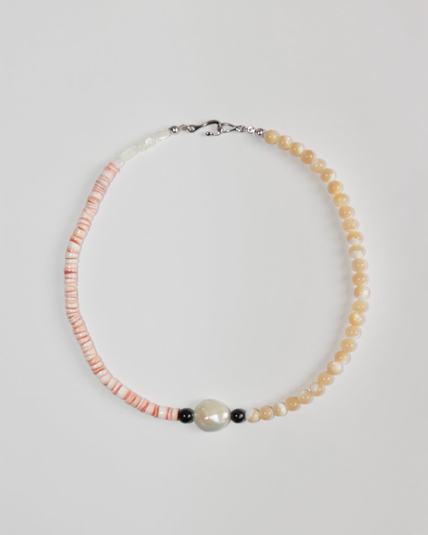 天然石のマザーオブパールやシェル、コイン型の淡水パールなど天然素材をたっぷり使用したやさしい色合いに、オニキスがアクセントとなったナチュラルでちょっぴりモードになれるネックレスです。