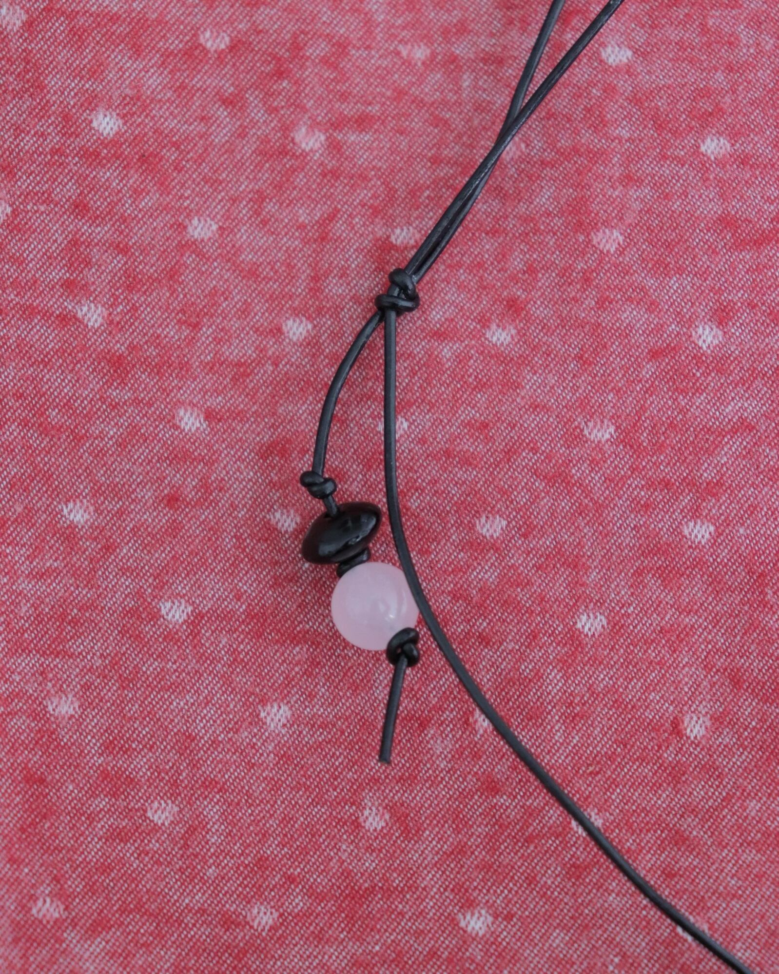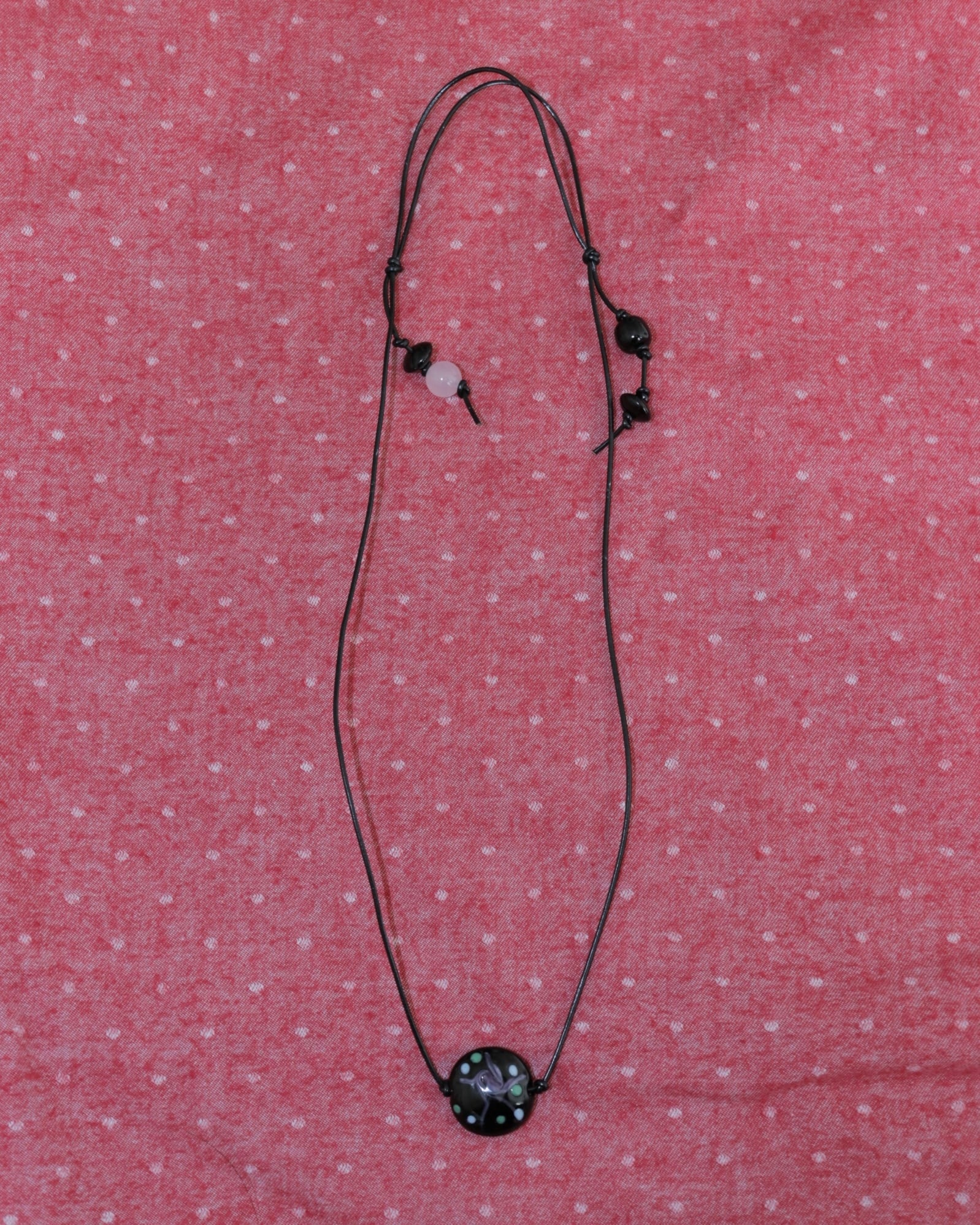 細めのレザーに、ころんとした水玉模様のガラスモチーフと天然石たちが甘すぎない可愛さを付け足してくれます。
